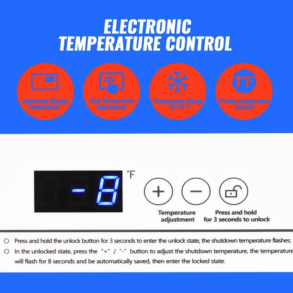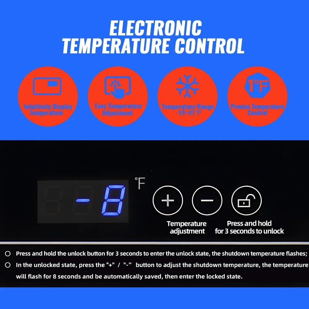 ðŸ’[Precise Temperature Setting] Our freezer has electronic temperature control. The electronic screen can display the refrigeration temperature of the freezer very intuitively. Enables precise 1°F temperature regulation. The freezer has a refrigeration range of -12℉to 50°F, so you can customize the temperature that is suitable for food preservation.