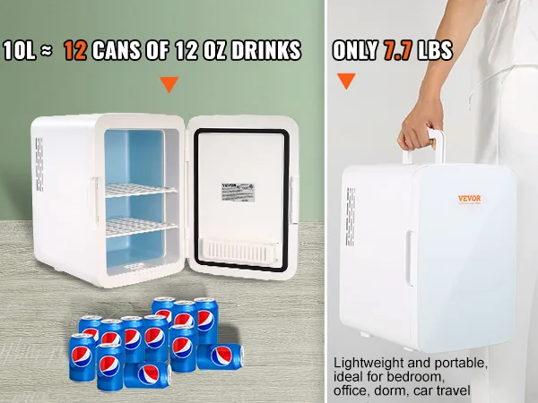 Compact but Spacious: Our mini-fridge features a small body, but it can hold up to twelve 330ml cans in its 10L capacity, weighing only 7.71lbs. Both sides are equipped with carrying handles to make it portable and easy to carry, ideal for storing food, drinks, breast milk, skincare products, medicine, and more.