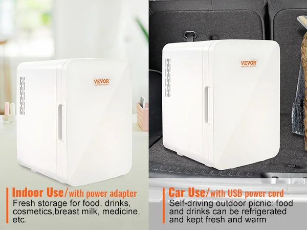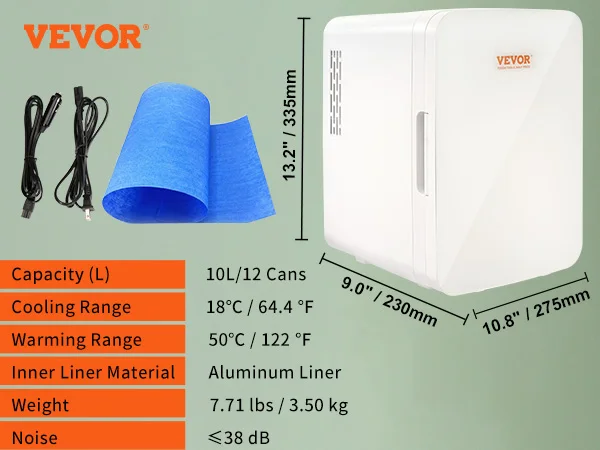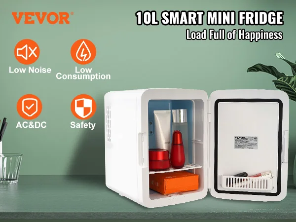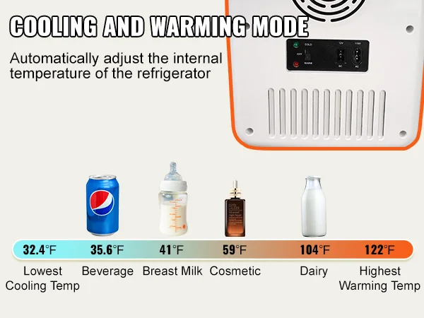 This 10L mini fridge has both cool and warm modes, and it can go 64.4 ℉ below ambient temperature and 122 ℉ above it. The â‰Â¤38db operation will not disturb your life. With home power adapter and 12V DC power cord, this Fridge is ideal for storing food, drinks, breast milk, medicine, cosmetics.